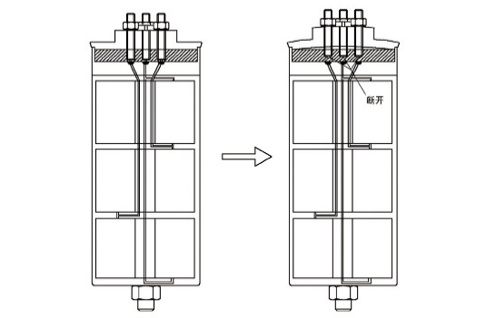 电容器外壳采用防爆式结构设计,一旦电容器发生非自愈性击穿而导致内部压力增加,电容器可以通过外壳形变,带动内置防爆器动作开路,使故障电容器自动脱离电网,有效防止故障电容器的爆裂现象。
