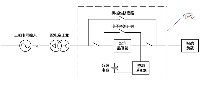 1、当系统正常运行时,快速开关处于合闸状态,负载由电网供电;