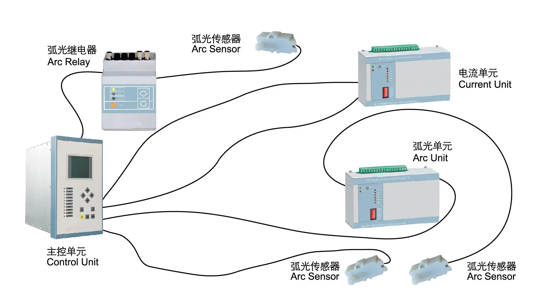 电弧光安全监控系统主要由主控单元(集成了电流单元)和弧光单元组成。